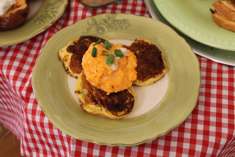Combine corn bread mix, eggs, and milk. Stir well. Add ¼ cup sour cream, chilies, corn, and cream style corn. Head olive oil in pan over medium heat. Once skillet is hot, drop cornbread batter in 1-2 TBSP at a time. Cook 2-3 minutes on each side, or until golden brown. Top with spoonful of pimento cheese spread and garnish with sour cream, if desired.